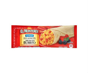 Egg & Bacon Frozen Breakfast Burritos (8) | El Monterey Ready in minutes, this filling frozen breakfast burrito will prepare you for the day. Our tasty Egg & Bacon Burrito includes real scrambled eggs, applewood-smoked bacon and cheese wrapped in an oven-baked flour tortilla. 11 grams of protein per serving Real scrambled eggs Fresh baked tortilla CLICK TO ZOOM GET COUPON
