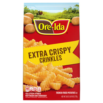 Ore-Ida Ready in 5 Extra Crispy Crinkles French Fries Fried ... These fries come packaged in a 4.75 ounce box for easy freezer storage. Your family deserves the highest quality because if it's not Grade A, it's not Ore-Ida! Product details Product Dimensions : 1.53 x 7.46 x 7.35 inches; 4.8 Ounces Item model number : 00013120012518 UPC : 013120012518 Manufacturer : KraftHeinz