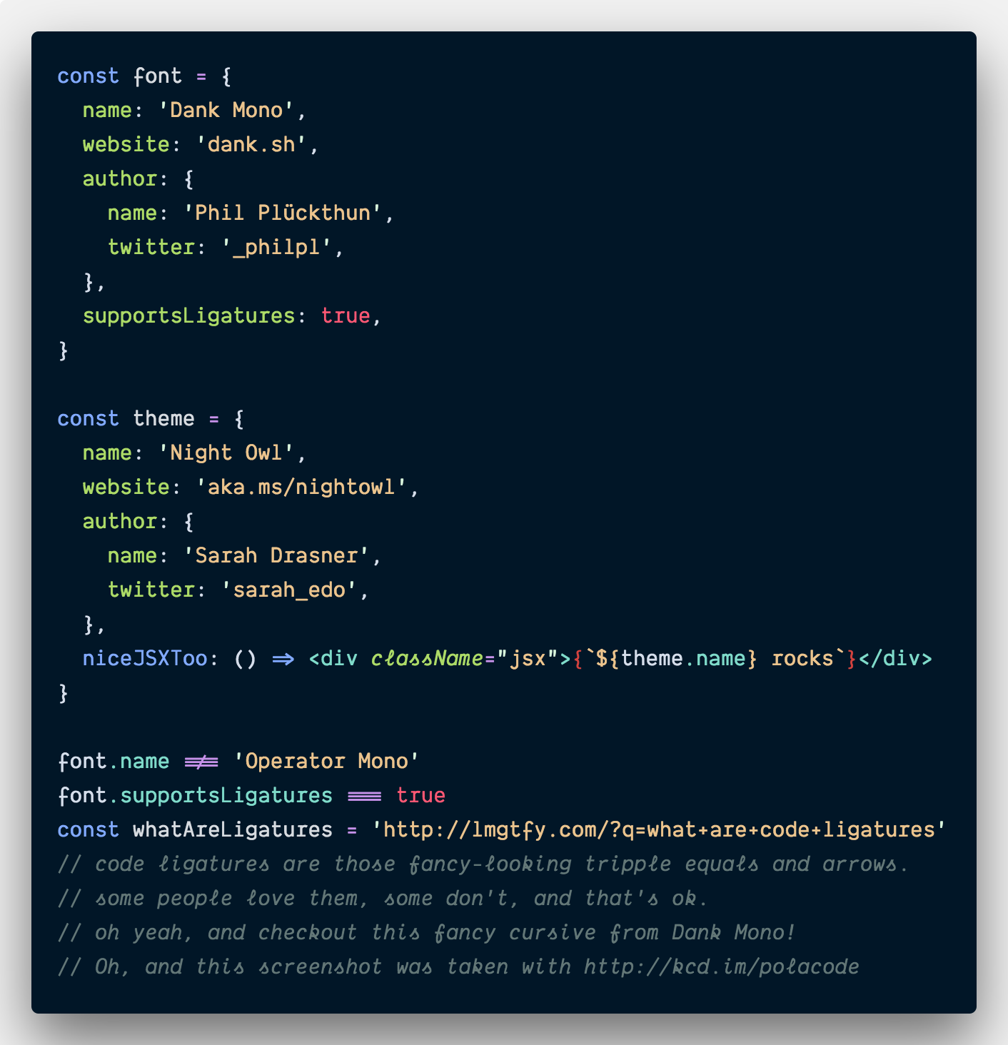 Dank Mono: The coding typeface for aesthetes - Gumroad A typeface designed for coding aesthetes with modern displays in mind. Delightful ligatures and an italic variant and bold style.The included character set includes latin uppercase and lowercase letters, all modifiers, and diacritics covering most European languages. Additionally it covers an exhaustive list of math symbols, the basic Greek glyphs, some terminal glyphs (e.g. unicode block ...
